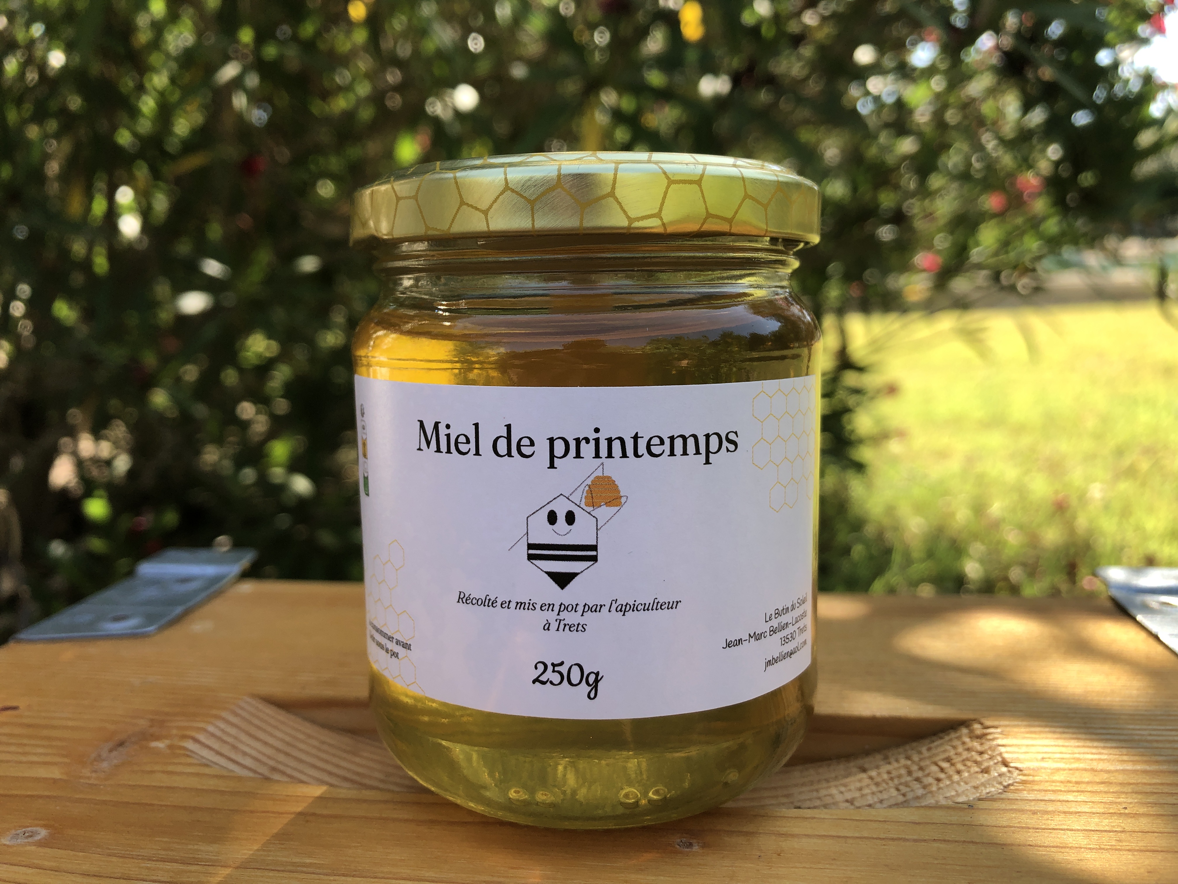 Le miel de printemps a été butiné de mars à mai. Les premiers nectars sont l’amandier et le laurier tin. Suivent les floraisons des fruitiers, pêchers, abricotiers, pruniers, cerisiers… ainsi que les fleurs de garrigue comme le romarin. Il est récolté et mis en pot début mai à Trets.